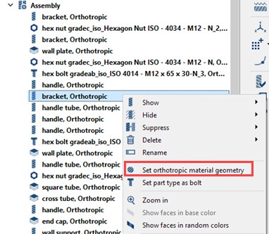 可以在上下文菜单中为中的选定零件定义正交各向异性材料装配工作台。