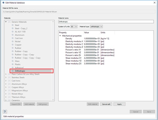 现在支持正交各向异性材料。这些材料的材料属性沿着相互正交的轴不同。您可以通过选择直生的材料类型。