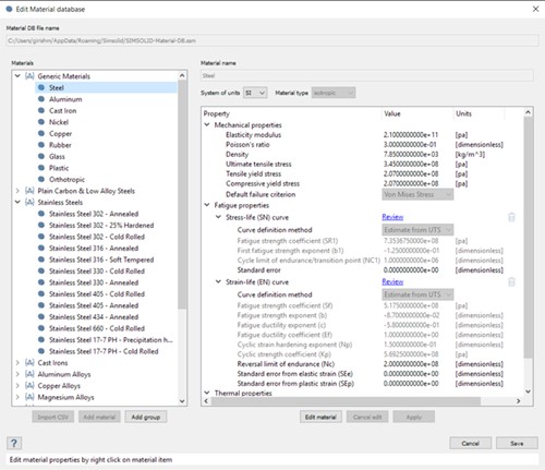 材料数据库现在支持正交各向异性材料特性和疲劳材料曲线。在疲劳特性下,应力-寿命和应变-寿命曲线都是受支持的。您可以从UTS估算疲劳特性,用斜率法输入它们,或者从。战斗支援车(combat support vehicle的缩写)文件。
