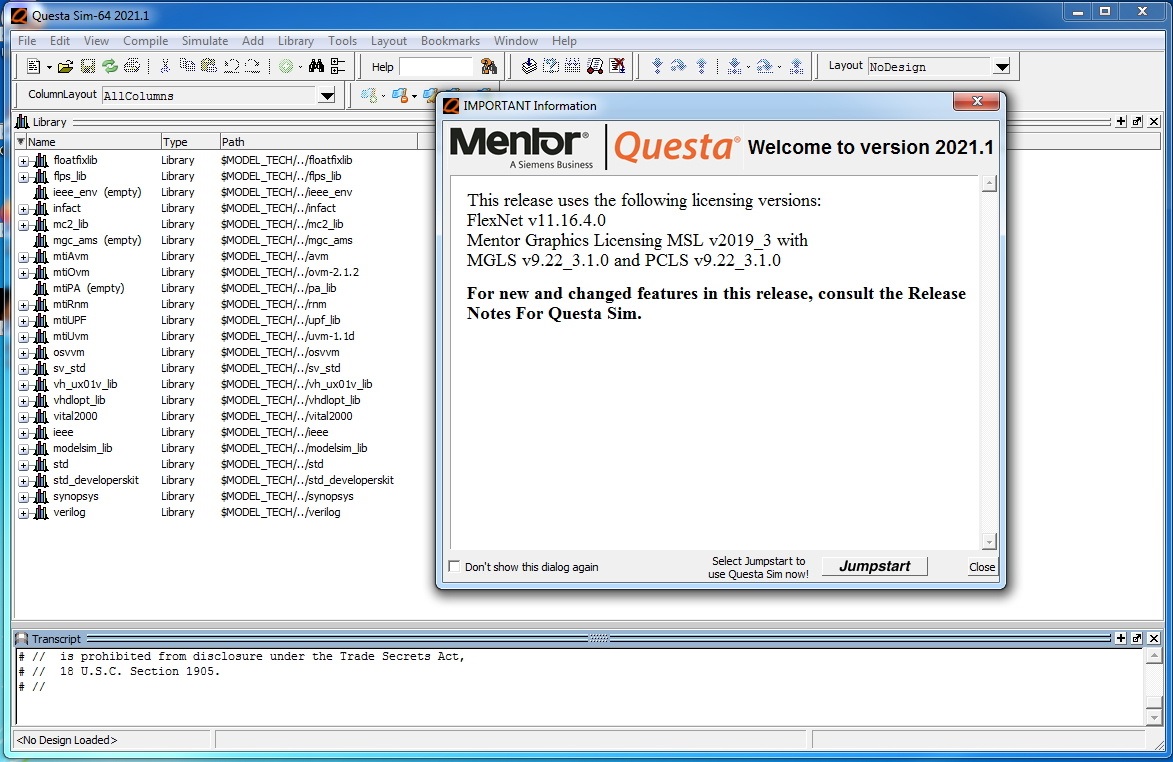 Mentor Graphics QuestaSim简称QuestaSim,它是一款专业强大的HDL语言仿真软件,基于标准的单核验证引擎,集成了一个HDL模拟器,用户可以自由灵活的创建工作和资源库、编译设计、优化设计、加载设计以进行仿真、模拟设计以及进行调试设计等各种流行的操作,支持多种常规操作模式,包括GUI模式,命令行模式和批处理模式。