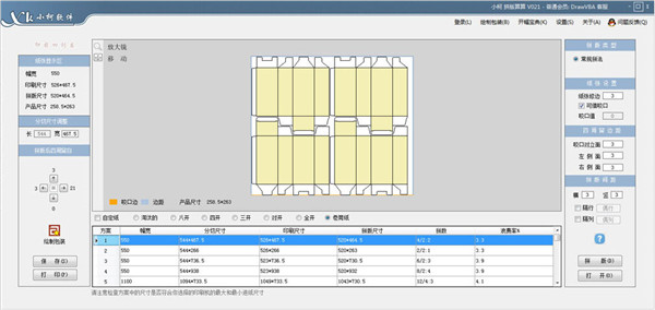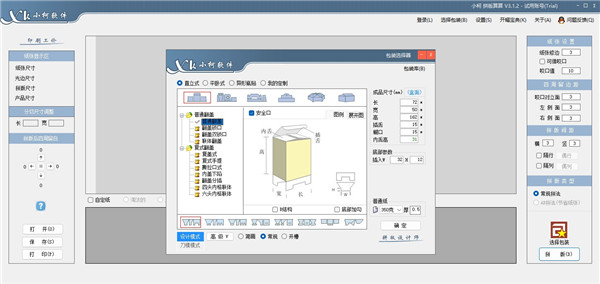 包装绘制的操作非常简单,选择一个符合你要求的类型,在右侧输入尺寸,点击绘制,中间区域即刻会显示该包装结构的平面展示图,窗口下端会显示该包装结构的展开尺寸。