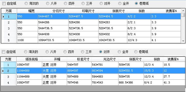 拼版显示区下端是分类开幅选项,点击其中一个开幅,即显示对应该开幅的拼版结果,如该开幅不可选,则说明该开幅没有合适的拼版方案。(如你需要查找到底那么开幅不合适,可以点击 淘汰的 这个方案中保留了所有没有列出的淘汰方案。