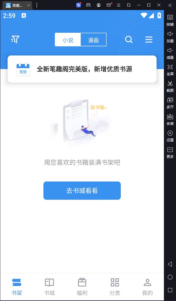 笔趣阁电脑版是借助模拟器在电脑上运行的一款网络小说阅读软件。软件内有着丰富的小说内容,涵盖了精选、男频、女频、排行、书单等多个分类,给用户提供了多元化的小说资源,满足用户对看书类型的各种需求,轻轻松松就能找到自己喜欢的作品进行越多。