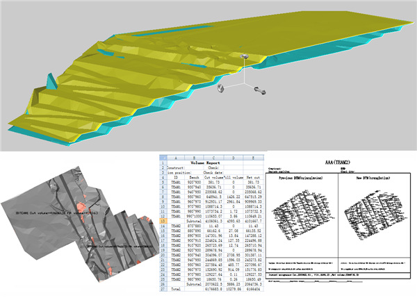 同时可精确计算多个区域(采区)的体积和表面积包括计算排土场的体积,填方、挖方工程量并自动生成相应的图表。与地质模型配合,准确计算掘进工程回采的矿石量和品位。