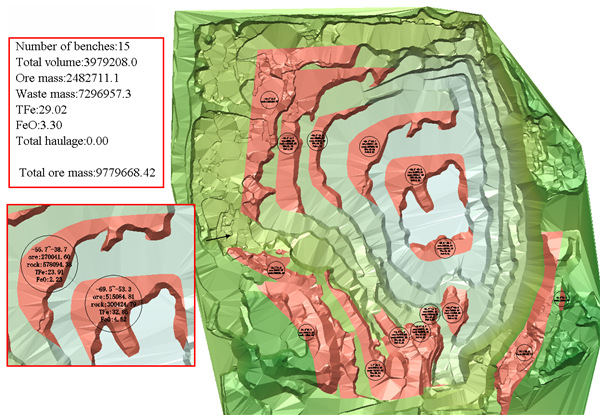 露天采矿设计的重要部分,是矿山预可研阶段对采矿方案的选定,对已开采矿山进行后期优化的实用工具。软件采用图论算法(Lerches-Grossman),定义经济模型,输入经济与技术参数,生成最优化境界模型及相应图形与数值结果。还可以调整经济参数,自动生成一系列嵌套境界,可用于各种参数在不同情况下的敏感性分析,为露天采场设计提供依据。
