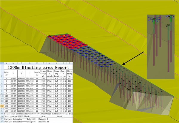 露天爆破设计模块具有方便快捷的孔网参数,布孔方式和钻孔参数的选择,不同位置不同角度的布孔方法,快速完成炮孔设计的参数和报表。具有灵活的炮孔编辑和修改功能。自动完成装药设计,按照相关参数,显示装药和填塞结果,同时按照要求形成炸药用量报告。可以按照爆破方式和导爆雷管延迟时间进行联网爆破模拟,进行露天爆破效果和时差分析。最后形成爆区的设计和露天爆破总量报告。