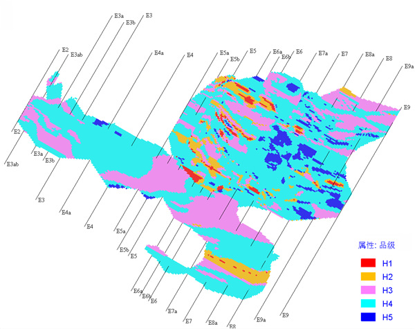 品味模型创建和运用 - 通过建立地质数据库、利用三角网建模技术,创建矿区地层模型、矿体模型、构造模型或其他类型模型,按照国际矿业领域通用块体模型概念,运用地质统计学估值方法。通过数据库和模型叠加显示,可对矿体空间展布、储量计算、动态储量报告、品位和不同属性的分布特点进行综合运用。