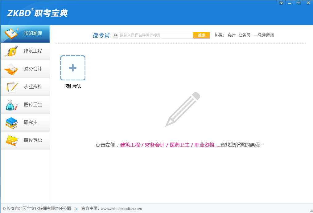 ZKBD职考宝典(职称考试复习软件)是由长春市金天宇文化传播有限责任公司精心打造的一款功能强大,涵盖丰富的多学科职称计算机在线学习考试系统,该软件适用于全国各个企事业单位参加职称计算机考试人员。其内容包括:医学高级、医学中级、职称计算机、职称英语、建筑工程、财会经济、职称资格、从业资格等八大方向,专注于为用户提供最新2018年职称资格考试类题库,近500个科目可选,让您随时随地想学就学。通过手把手教学一步一提示,同步答案演示帮助您高效掌握解题方法。模拟考试10套全真试题,共400道左右的真题,自动评分,考后即知成绩,错题复习帮助您查缺补漏。名师课堂,专业教师耐心细致讲解各个知识点,零基础也可以轻松学会。错题收集,错题复习自动收录做错题目,您可以将错题调出重做,加深印象。考试指南,软件帮助备考指南、答题技巧、考试大纲、常见问题让您对职称计算机考试更加了解,自信备考。