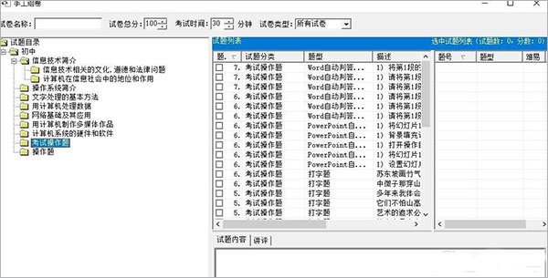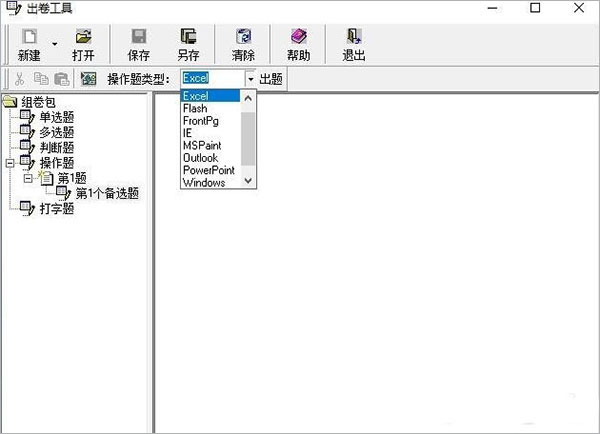 下图为出卷端,可以选择判断及操作题等,操作题目经过测试,测试题题目支持office2013 进行答题,出卷也支持office2013,兼容最好的应该是office2007或者2003版本,暂时未发现其他问题;