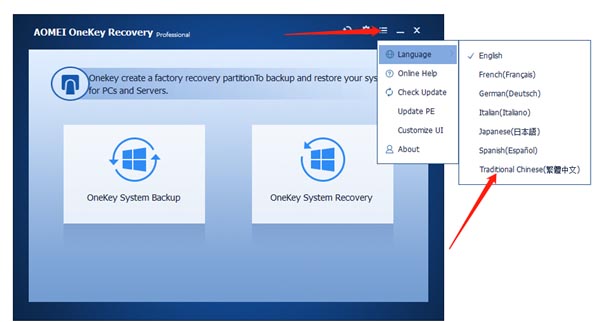 5、点击右上角,选择Language可以修改为繁体中文即可。