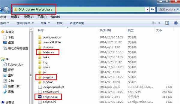 2、找到 eclipse 目录下 "plugins" 和 "features" 文件夹,将下载好的的 svn 对应名称文件夹下的内容复制到 eclipse 的同名文件夹中