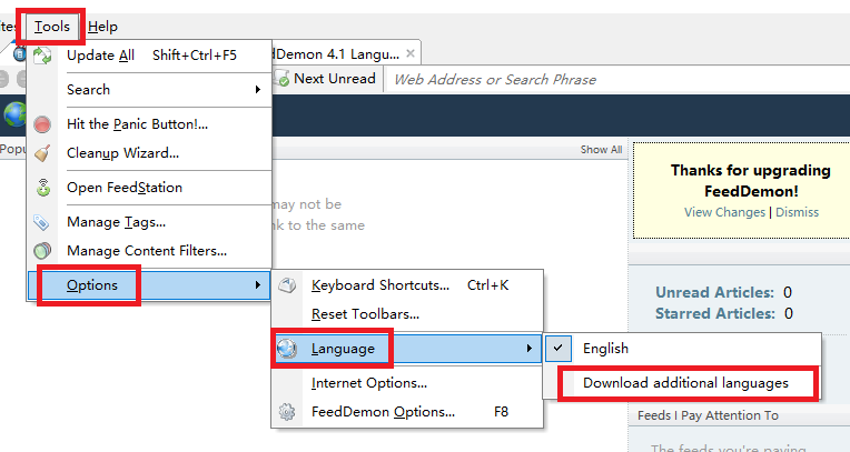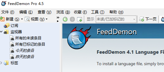 1、一般情况下,安装FeedDemon默认打开为英文界面。
