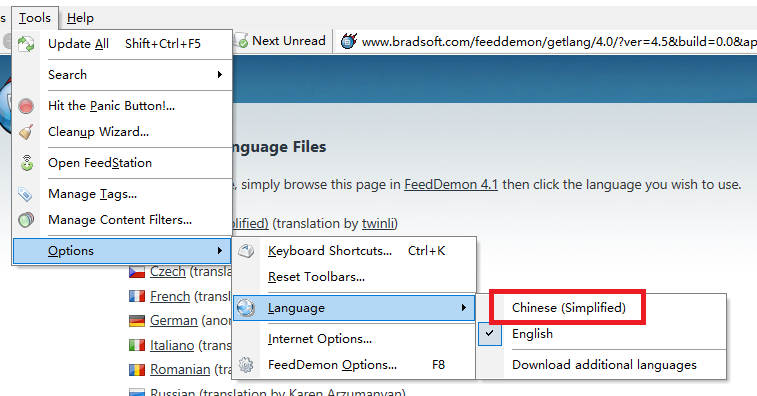 2、选择顶部菜单栏上的Tools——Options——Language选项,语言栏里只有英文,我们需要点击第二个选项Down additional languages,进入语言下载界面。