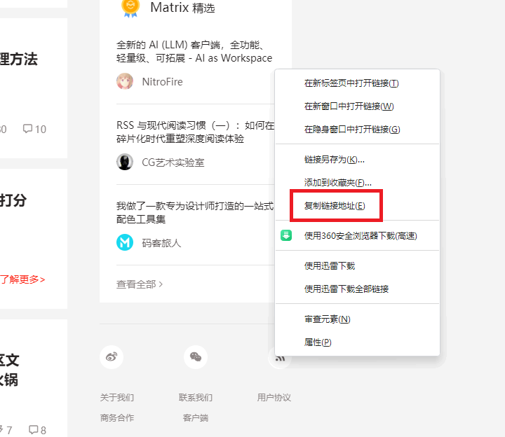 1、寻找网站的订阅链接,有些网站里会有订阅符号,一般在网页底部,以WIFI标志呈现,右键点击复制链接。