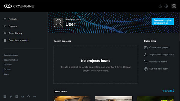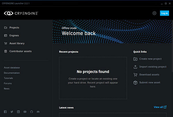 4、使用 CRYENGINE 帐户登录启动器后,您应该会看到以下仪表板