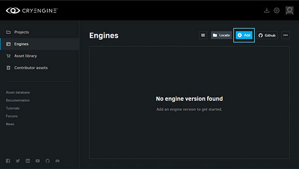 5、单击启动器左侧面板中的“引擎”选项卡打开引擎库,然后单击库右上角的“添加”按钮,如下所示。