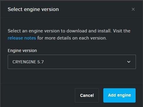 6、这将打开“选择引擎版本”覆盖窗口。 从引擎版本下拉列表中,选择您想要下载的 CRYENGINE 版本,然后单击添加引擎按钮。
