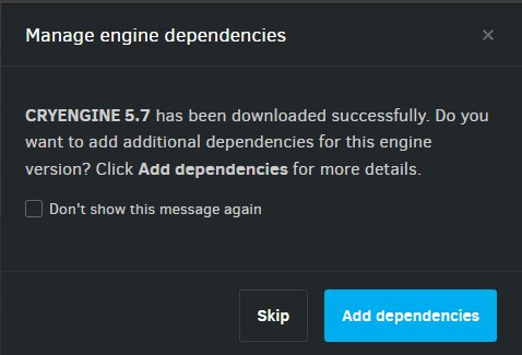 8、下载完成后,您应该会看到“管理引擎依赖项”提示,您可以选择安装使用游戏代码、第三方中间件、插件等所需的各种组件。