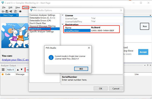7、双击打开PVS-Studio软件,点击Tools--Options--Registration,将“key.txt”文件内的姓名和注册码复制到软件中