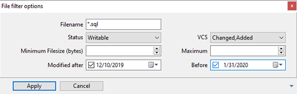 现在,您可以根据名称,大小,日期,只读状态和版本控制状态来过滤文件。 您可以在选项对话框中指定过滤器: