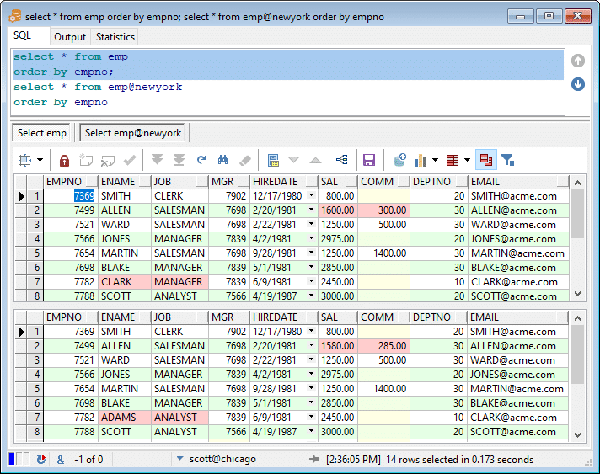 SQL 窗口允许您输入任何SQL语句或多个语句,并在网格中查看或编辑结果。结果网格支持按示例查询模式以搜索结果集中的特定记录。您可以轻松地从历史缓冲区中调用以前执行的 SQL 语句。 SQL 编辑器提供与 PL/SQL 编辑器相同的强大功能。