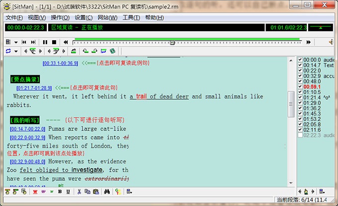 最基本的功能--“区域复读”1、启动SitMan,打开一个语音文件,开始播放;