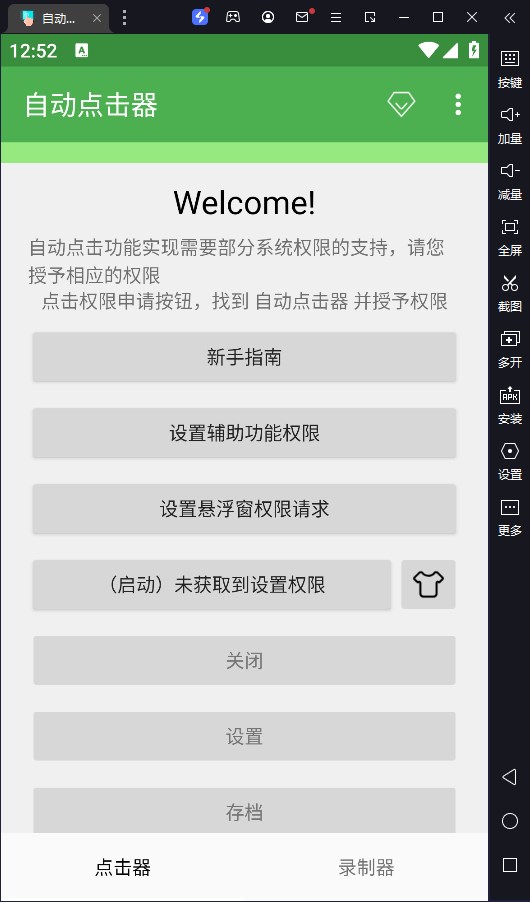 这个是个系统bug,Accessibility Service有些时候会不能正常工作,一般情况下杀掉应用重启,重新赋权就好了,还有很多时候必须要重启手机才能使用……系统问题,暂时解不了 自动点击器通过浮动控制面板以启动/结束自动点击。您可以使用控制面板在屏幕上添加点击位置实现自动点击。 点击位置保存功能,下次回来继续使用 支持模拟Home键,返回键,打开状态栏 支持滑动功能 支持异形屏手机 长按点击位置的控件会弹出单点的参数配置,可以设置单点的延迟,触摸时长,重复次数 通过设置可以设置全局的点击间隔,触摸时长,重复次数。还有快速设置功能 请不要用于刷单等违反社区规则的操作 自动点击器使用Accessibility Service实现自动点击,需要Android 7.0以上系统。低版本手机无法支持,还请谅解。更新日志