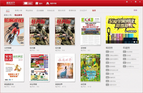 该主界面自动显示的是其主打项目-海量杂志,包括超过一万本的各类型杂志,共分为新闻人物、商业财经、运动健康、时尚生活、娱乐休闲、教育科技和文化艺术等七类;此外,读读宝主界面还会不断更新,显示最新上架的杂志,频繁的更新可让用户随时接收最新鲜的杂志信息。