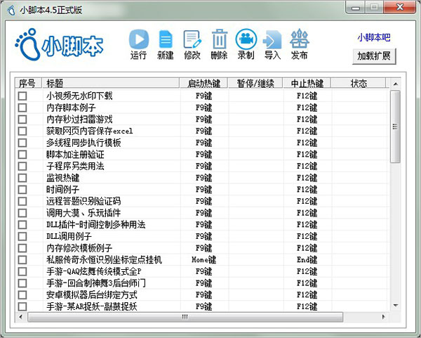 一款优秀的模拟按键能帮助用户解决繁琐重复的操作,如小视频无水印下载、内存脚本例子、监视热键、微信挑一挑等等功能,小编本次带来的是小脚本免费版,这是一款强大的模拟鼠标键盘按键软件。其中用户可自由简单进行编写脚本,能够帮助用户键盘鼠标操作、后台找图找色找字、网页自动化操作、(IE、miniblink)读写内存、驱动等功能,同时还支持第三方插件,能通过简单易学的操作编写全中文代码,从而单独生成相关脚本。另外,软件当中有着相应的热键功能,只需轻松在项目前进行打钩,点击运行后启动热键即可使用,在此过程中如想修改脚本,点击对应脚本名称,即可轻松进行修改。简而言之,这款小脚本按键模拟软件不论给新手编程用户练手还是编程大神提高工作效率等等,都十分值得用户下载体验,欢迎有需要的朋友在本站下载!