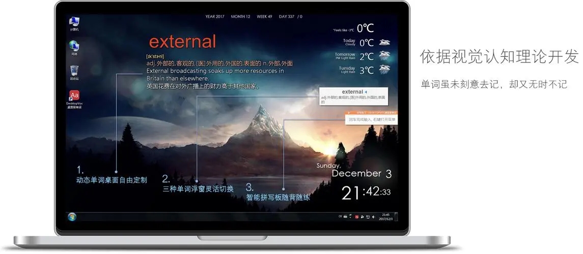 1、DesktopVoc桌面背单词是一款“碎片化学习,系统化复习”的高效单词记忆系统。它融合艾宾浩斯遗忘曲线模型与 SuperMemo 记忆算法,革新传统死记硬背的单词学习方式,提供个性化学习、复习与测试方案。配合高清语音与实境例句,碎片时间背单词更加轻松方便!2、拥有多种精美皮肤与丰富显示效果,适用于不同使用场景。迷你单词窗口能够自由的浮于桌面顶部或嵌入桌面背景之内。依据视觉认知记忆原理,单词虽未刻意去记,却又无时不记!