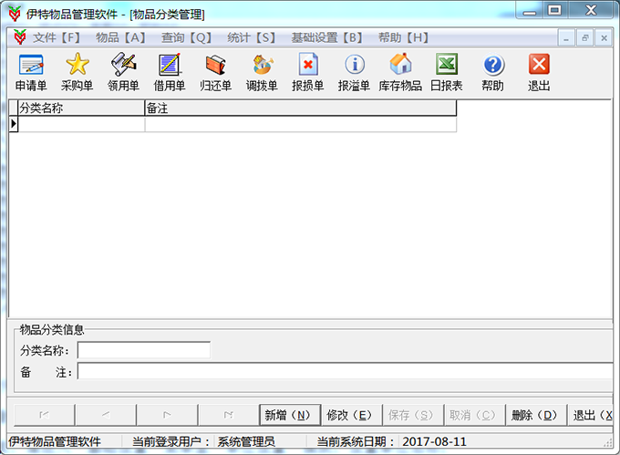 6、使用前,请进入“基础设置”菜单里“物品分类管理”模块,设置各种物品的分类名称;