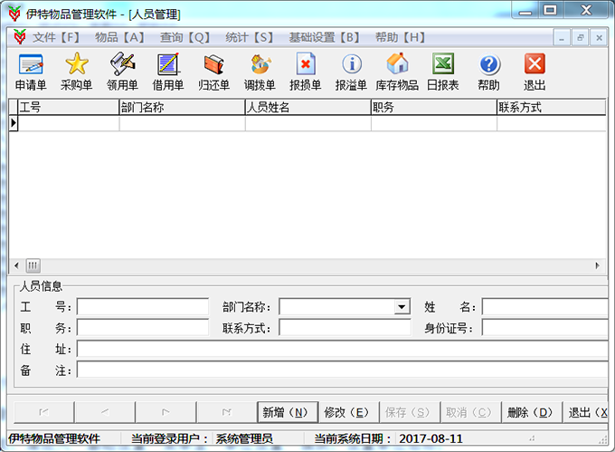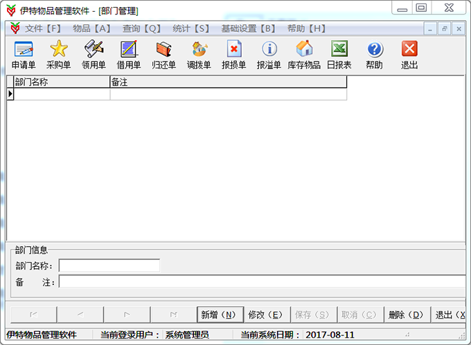 2、部门设置——设置单位的部门信息,将来可以按部门查询领用,借用物品信息。