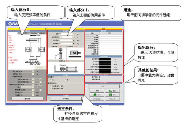 气动标准回路选型的简易版与气动标准回路的选定功能完全相同,用较少的输入和操作便可选定是面向初学者的版本。如下图所示分成必要的最低限度的重要的输入条件(输入部分Ⅰ)和变更频率低的条件(输入部分Ⅱ),另外,输入界面和输出界面集中,力图画面紧凑、操作简化。