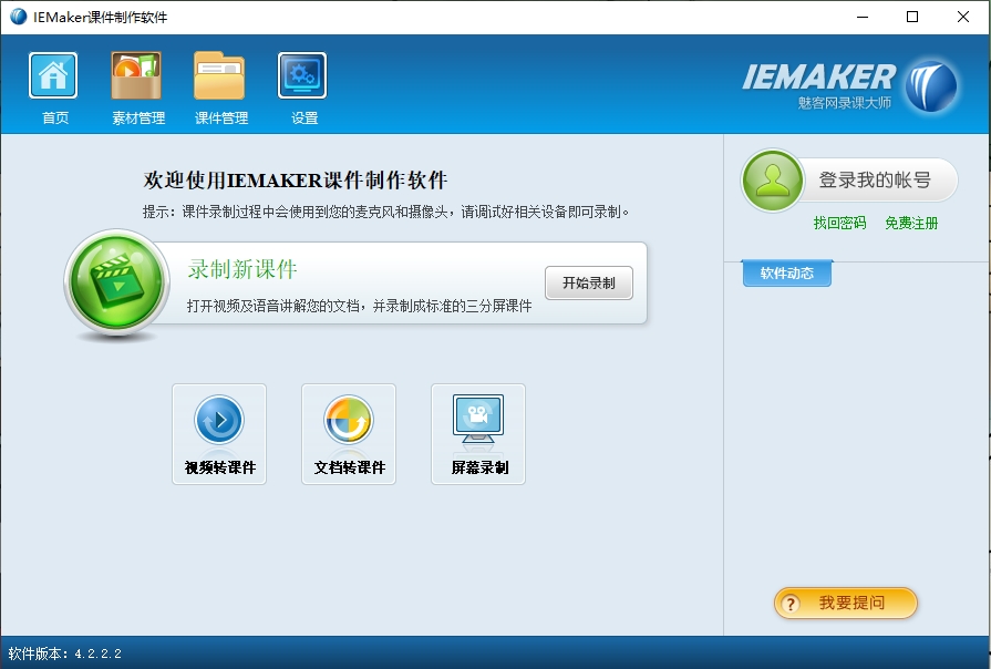 IEMaker课件录制软件是一款功能强大、实用性强、集课件录制、编辑、内容控制多功能于一身的多媒体课件制作软件。IEMaker软件的主要核心功能是为文档(PPT、PDF、WORD)等配上视频语音讲解,从而实现多媒体课件表现形式。在课件录制时,你可以使用虚拟的指示棒指出课件的重点内容,也可以红色铅笔划出重点内容!并且,生成的课件可以还能跨平台运行,无需进行额外的转化或处理,课件录制完成后,还可以一键发布到互联网上分享。