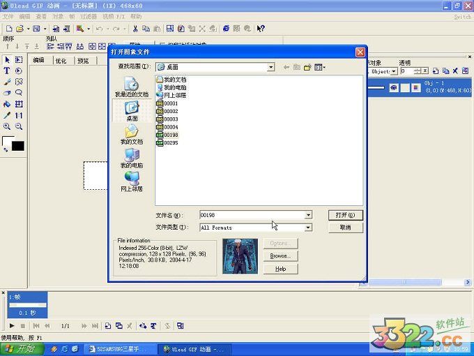 1.用ulead gif animator 5中文版打开要修改的GIF动画。点击“文件”→“打开图象”,找到要修改的图片,单击打开按钮(如下图)