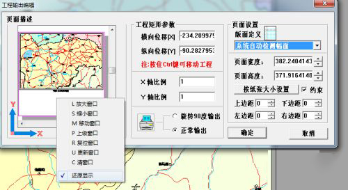 3、在页面描述下边空白处单击鼠标右键,弹出下拉菜单选择“还原显示”可以预览图所在幅面,选择“移动”可以移动地图所在版面位置;