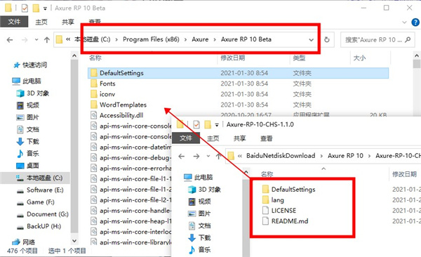 1、下载解压,得到Axure RP 10原程序、汉化补丁;