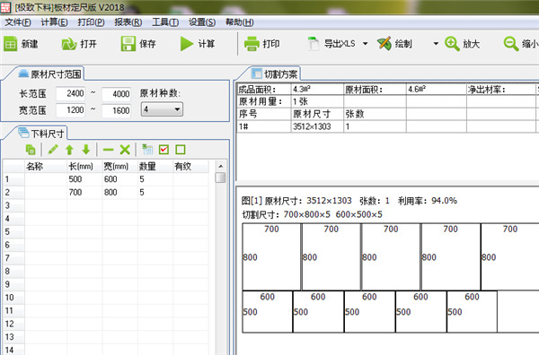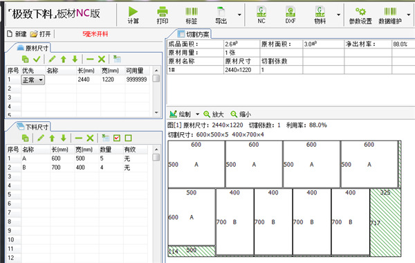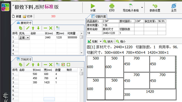 1、极致下料板材标准版已知板材原材尺寸,已知要切割的板材尺寸,计算如何排版切割最省材料,以及原材用量。