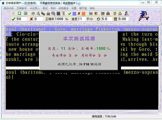 4、在规定的时间内,软件会自动给出你的测试成绩,对你的速度、正确率给出评分。你可以根据这个来调整练习的重点。