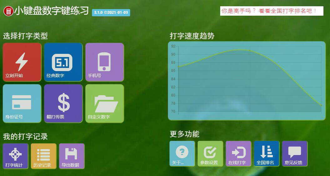 1、全新的软件界面采用Flash技术开发的小键盘练习工具,使用了全新界面设计。