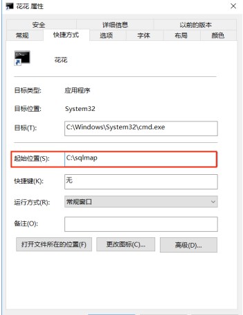 ④在生成的SQLMAP下右键属性,修改起始位置为你储存sqlmap的起始位置,点击应用,确定