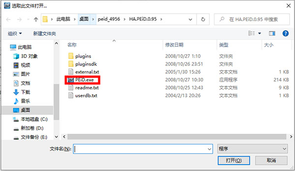 3、会弹出一个选择文件的窗口,我们单击我们需要查壳的文件,再点击右下角的 【打开】 按钮