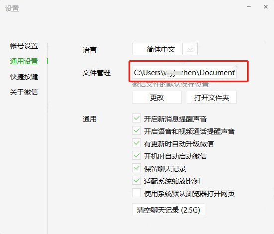 1、登录pc版微信,从设置 – 通用设置中 找到对应路径,默认是C:\我的文档\WeChat Files\;(注:此指引适用于2.6.3版本以上的PC微信)