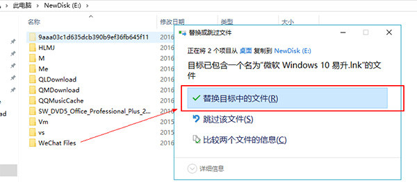 4、用迁移过来的WeChat files 覆盖至新电脑B的WeChat Files. 选择替换目标中的文件;