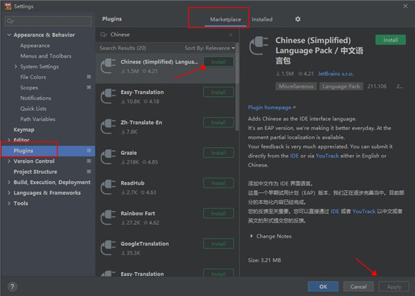 6、直接快捷键“Ctrl+ALT+S”打开“Settings -> Plugins”,在marketplace的搜索框中输入“Chinese”,找到汉化插件“chinese(simplified) langua...”在点击“install”进行安装;