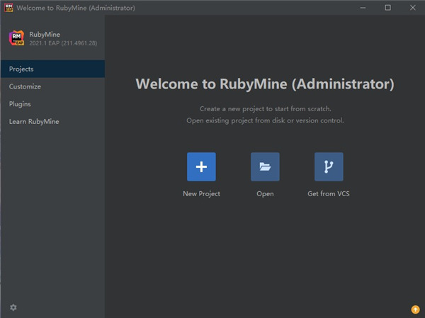 RubyMine 2021 提供了重新设计的欢迎屏幕。 现在,您可以在 Projects 选项卡中访问和排列项目,在 Customize 选项卡中设置 IDE 界面,在 Plugins 选项卡中管理插件,以及在 Learn RubyMine 选项卡中访问学习资源。