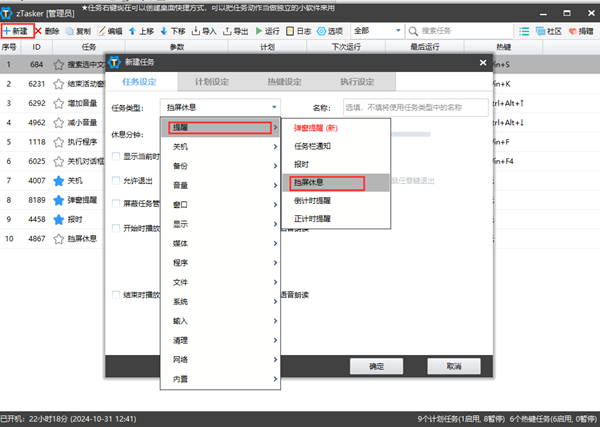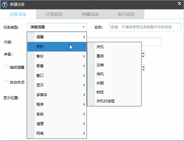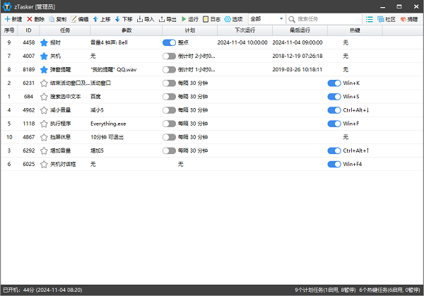 一、各种任务类型 提醒、关机重启等、报时、挡屏休息、文件备份、音量调节、静音,窗口|显示器控制,多媒体、截图、录音录像,程序、进程、服务等操作,更换墙纸,系统清理,网络操作,文本搜索、热键转发等等,任务既可以用定时或者条件触发,也可以用热键触发,任务日志,方便查看任务执行情况。