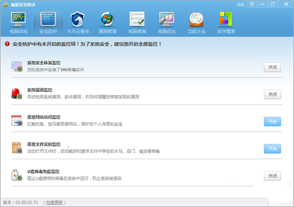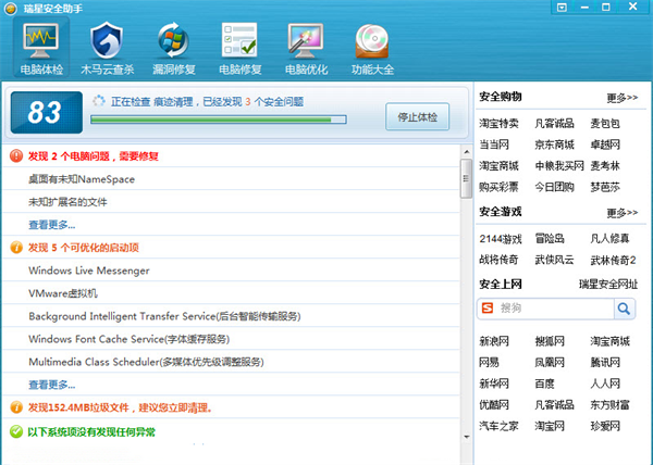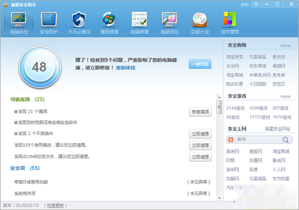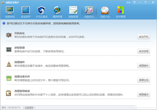 利用已安装软件强行推销其他“附加品”已经成为桌面产品的一大“弊病”,并为钓鱼网站和木马病毒入侵埋下诸多隐患。瑞星安全助手继承了原瑞星卡卡上网安全助手中备受欢迎的电脑修复、插件清理、系统优化等多项功能,保证用户电脑时刻处于优良状态。