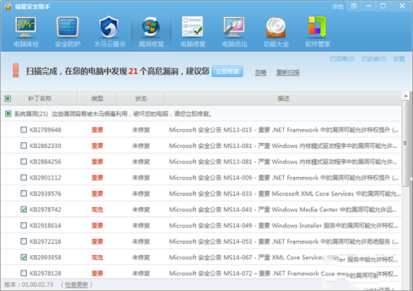 4、漏洞修复第一时间获取系统补丁的更新信息,并快速地为用户的计算机打上漏洞补丁