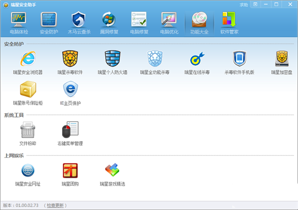 瑞星安全助手,瑞星出品的专业电脑安全维护软件,可以对用户的计算机进行木马查杀、漏洞修复、安全防护等诸多保护,瑞星安全助手不仅可以对电脑进行深度的修复,还可以对电脑的程序进行优化,让用户的计算机可以有更快的运行速度,更好的为用户服务。瑞星安全助手还为提供了多款安全防护的系列工具,诸如瑞星安全浏览器、瑞星杀毒软件、瑞星个人防护墙等等,让用户的计算机可以有更好的防护保护,彻底杜绝病毒的危害威胁到用户的计算机。